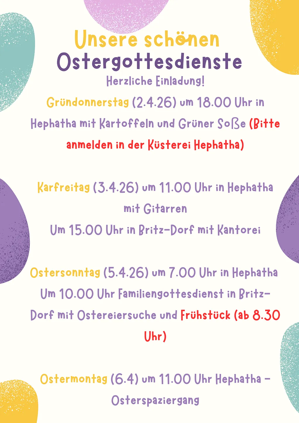 Die Küsterei bleibt vom 13.4. bis 23.4.2026 geschlossen.